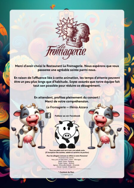 Nous proposons des mets typiques de la cuisine suisse : Des fondues, des raclettes et des croûtes avec le fromage que nous fabriquons sur place, des Rösti maison, des grillades viandes cuites au feu de bois...